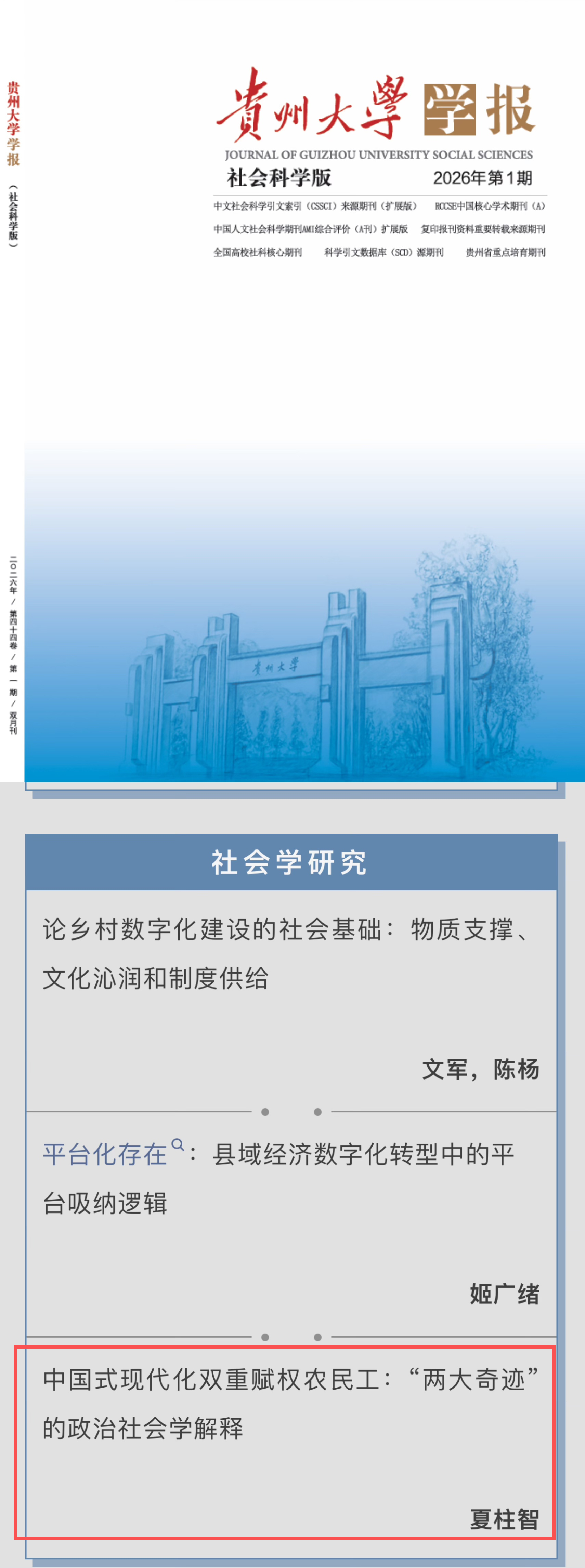 《贵州大学学报(社会科学版)》2026年第1期刊发成人论坛