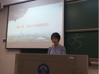 2017级硕士研究生杨旸同学代表社会学系全体老生发言。杨旸同学感慨一年来以读经典著作为中心的充实的研究生生活,并向同学们分享几点感悟,一是热情,对待研究生学习与生活要充满热情;二是坚持,坚持做一个勤读书、会自律的人;二是沟通,主动与导师、同学沟通,做一个积极乐观、主动学习与分享的人。